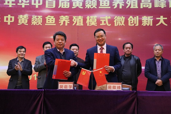 樊启学与大北农神爽水产科技集团总裁签订技术合作协议 副校长姚江林致欢迎辞 桂建芳院士致辞 3月9日上午,“华中首届黄颡鱼养殖高峰论坛”在国交一楼报告厅举行。