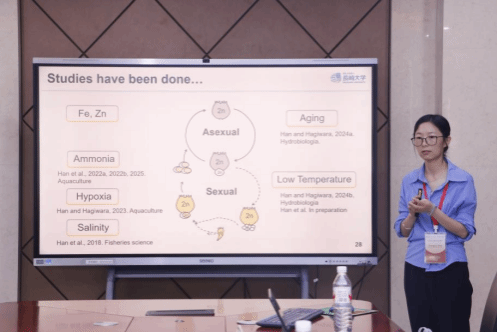 长崎大学韩程燕助理教授随后以《轮虫生物学与环境相互作用:对水产养殖生产的影响》为题进行分享。她的研究聚焦于海水鱼苗的天然饵料,以Brachionus轮虫为核心对象,深入探究其繁殖性能与环境因子的关联机制,系统揭示了温度、盐度、氨氮浓度、金属离子浓度等环境因素对轮虫繁殖策略灵活性的调控规律。其研究结果为水产养殖中通过优化微量元素浓度提高轮虫产量提供指导。