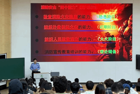 讲座开始前,吴飞越教官播放了消防宣传视频。随后,他从消防安全“四个能力”分别进行了宣传及培训,包括检查消除火灾隐患、组织扑救初起火灾、组织人员疏散逃生、消防宣传教育培训四个不同阶段的能力。吴飞越以典型火灾案例为基础,通过触目惊心的事故现场照片与视频、详尽的数据,深刻剖析了电动车违规进楼充电、老旧插排超功率等多个火灾案例发生的原因及危害,使同学们直观地了解到火灾发生的突发性与破坏性。“除了火灾的扑救,检查与消除潜在的火灾风险尤为重要。”吴飞越结合51暗网