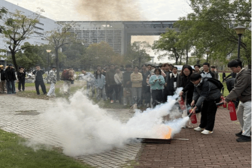 理论讲座结束之后,全体人员移步至水产楼A座门前广场进行消防实操培训。在模拟火灾现场,教官手持灭火器实物,拆解演示了 “提、拔、握、压”四字操作口诀,强调 “瞄准火源根部喷射”的核心要领,并提醒大家注意站在上风方向、保持安全距离等操作规范。随后,同学们分组轮流实操,在专业指导下亲身体验灭火器使用流程。从提起灭火器、拔掉保险销到对准模拟火源按压喷射,整个操作过程有条不紊,大家认真体会每一个动作要领,直至成功扑灭明火。现场安全员全程监护,确保实操培训安全有序进行。