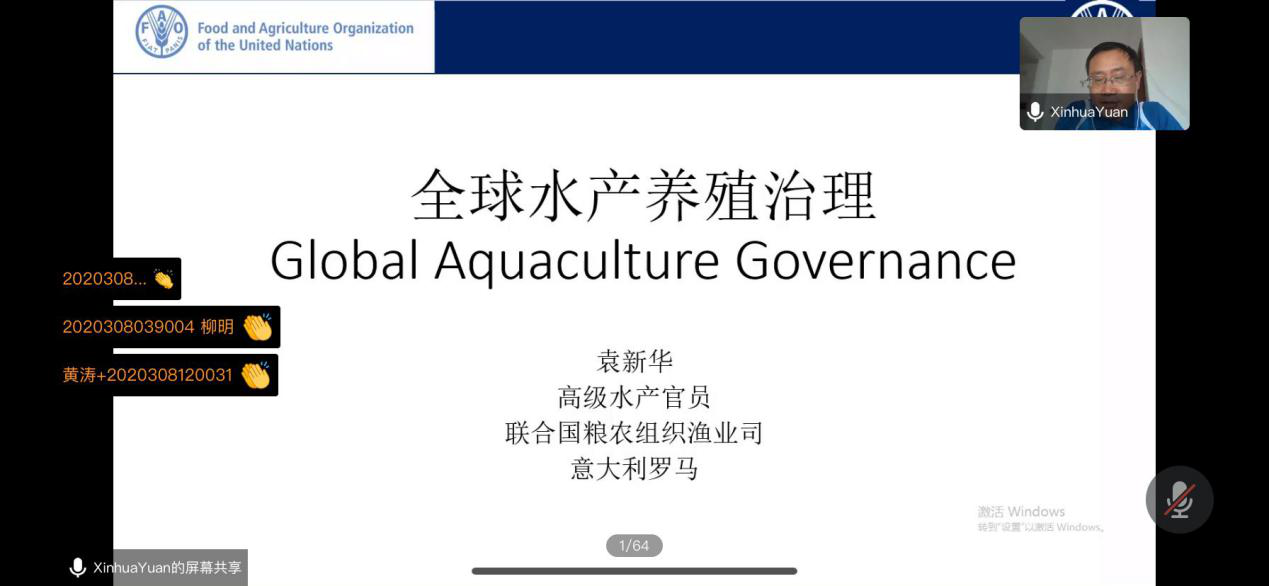 水产讲坛通过腾讯会议在线上举行,联合国粮农组织渔业司高级水产官员袁新华博士应邀作了题为“全球水产养殖治理”的报告,并就在校生申请国际组织实习机会给予指导意见。200余名师生参加了报告会,报告由51暗网