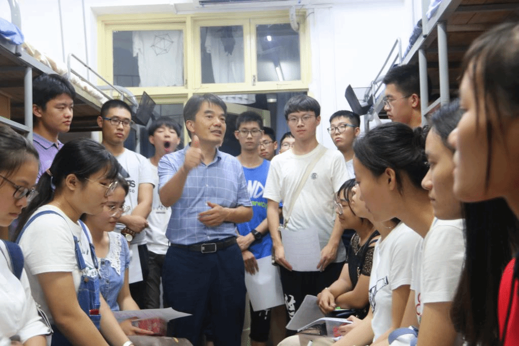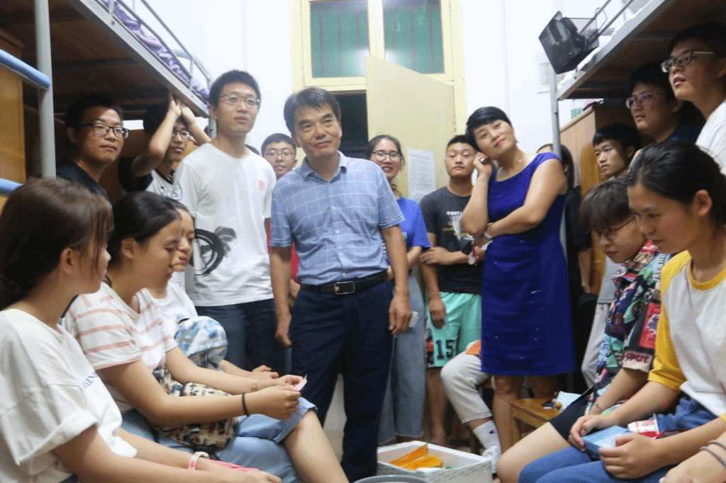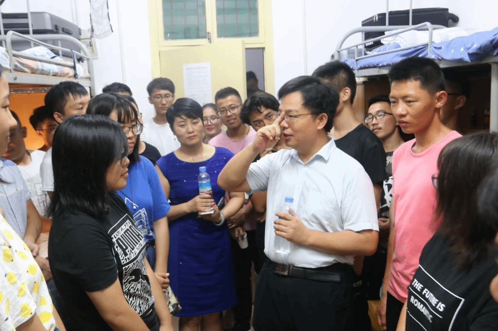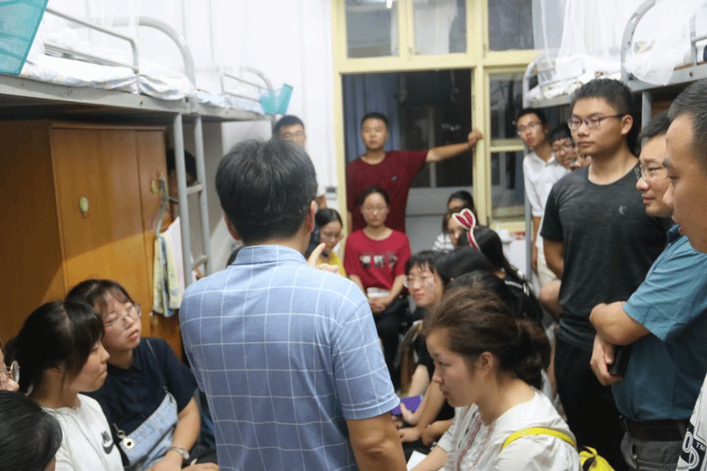 于荟园五栋召开2018级新生第一次班会。院党委书记张韶东,副院长黄丹,党委副书记刘广乐,辅导员蔡徐涵、吴昊、庄子梦、操文杰深入寝室慰问新生,了解新生动态,与新生一起展望大学。