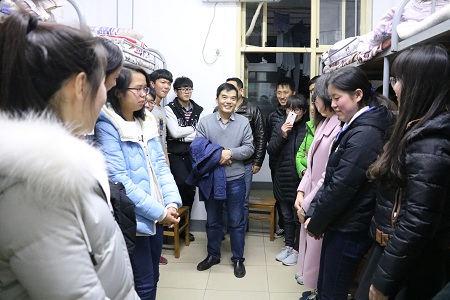 慰问期间,同学们对于院领导的巡访表示热烈的欢迎。院领导也与在场同学进行积极的互动,在解答同学们问题的同时,也对同学们提出了新的要求。在水族1503班,副院长黄丹就英语学习及英语考试提出了自己的建议,并说:“在新的学期里,同学们要学好英语,不断的搭建自身条件,才能在未来抓住成功的机会。”王卫民院长举用自己对于澳大利亚养虾业的考察经历进一步强调了英语学习的重要性。 走进水产1505班,欢声笑语中,院长亲切询问了在场同学们的新学期第一课,并语重心长的说:“在未来的学习过程中,每一位同学都要把所学专业学好,并培养自己的创业创新精神。要敢想敢拼。”