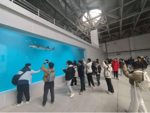 在中华鲟养殖区,三峡集团高级工程师管敏为同学们详细介绍了中华鲟人工繁育、养殖的科研成效。两米多长的中华鲟让同学们无不驻足惊叹。