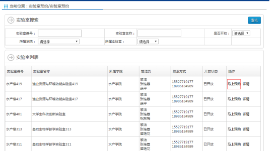 用户可通过实验室(会议室)名称或者编号,查询要预约的实验室或会议室,点击下图的马上预约。