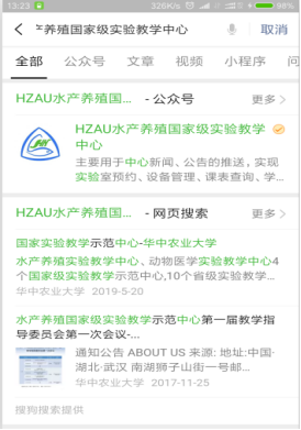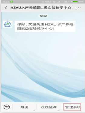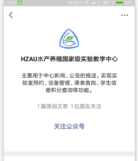 在手机微信APP搜索微信公众号【HZAU水产养殖国家级实验教学中心】,点击【关注公众号】。