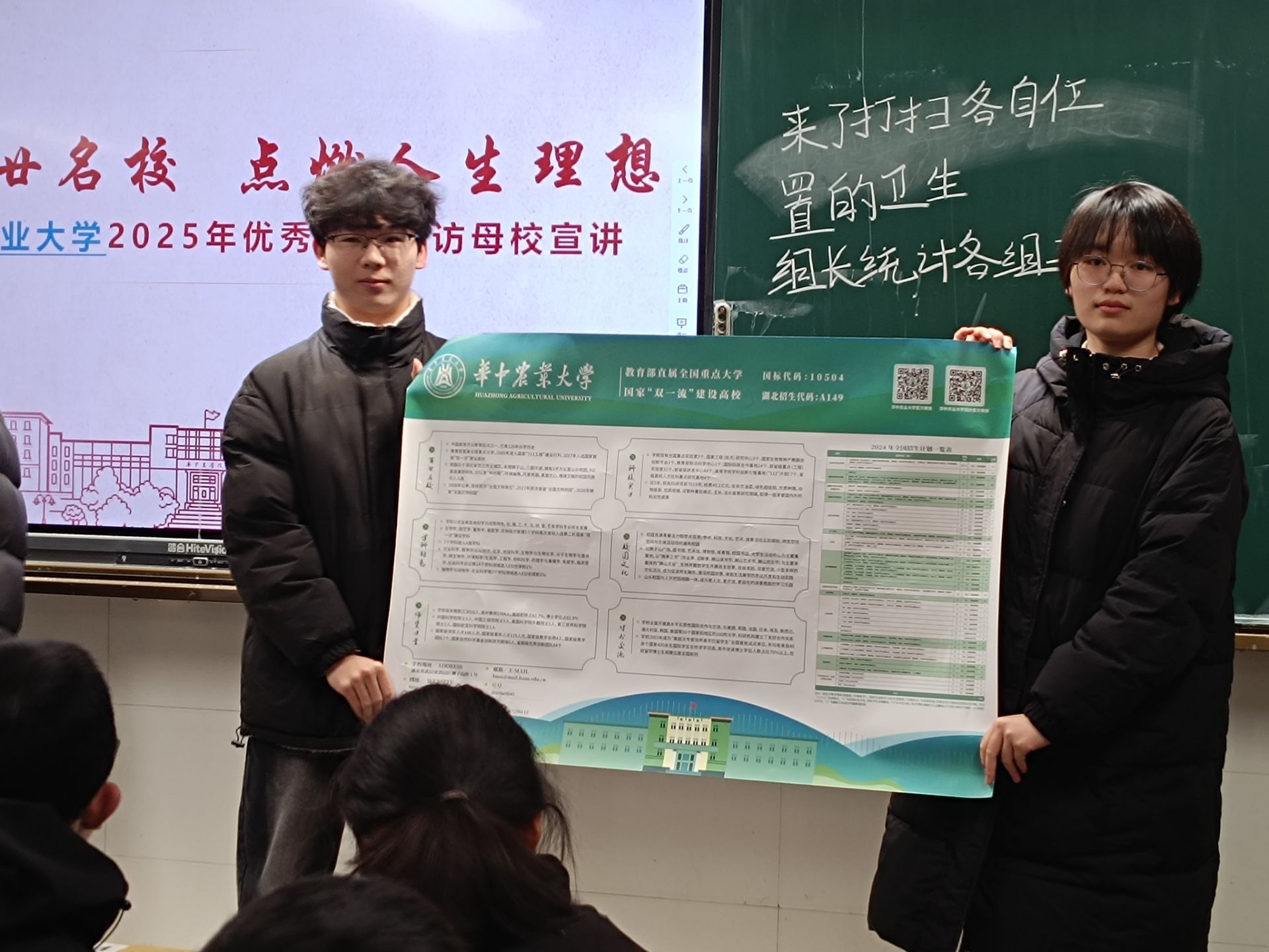 为进一步加强与各学校的联系,回访实践团精心策划了此次回访活动。活动围绕“学子反哺母校、榜样引领成长”的核心理念,通过校友经验分享、学科特色展示、沉浸式校园文化体验等形式,向仙桃中学的师生及家长传递华农精神、学科优势与人才培养成果,旨在激发高中生对现代农业科学的兴趣,助力其明晰生涯规划。