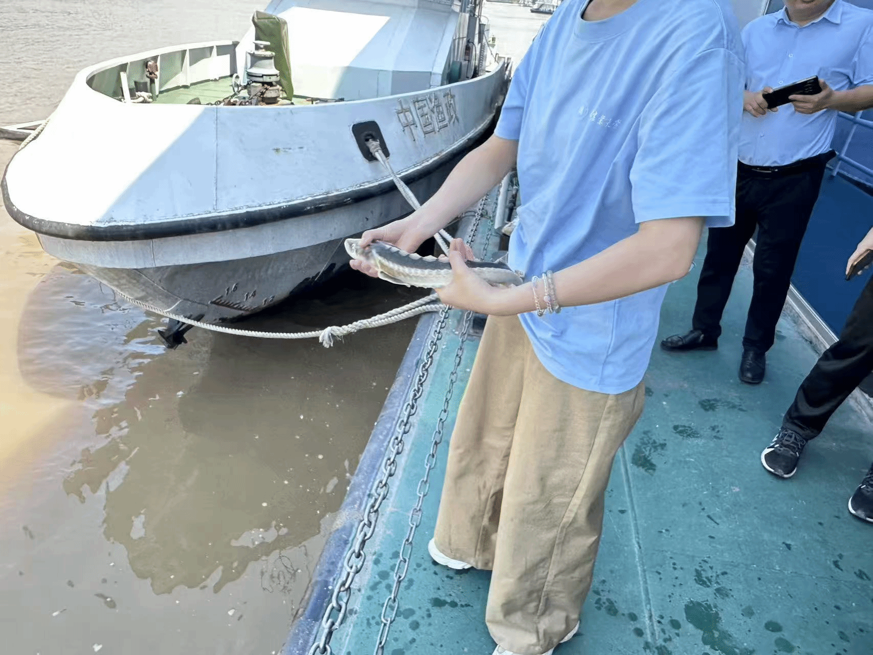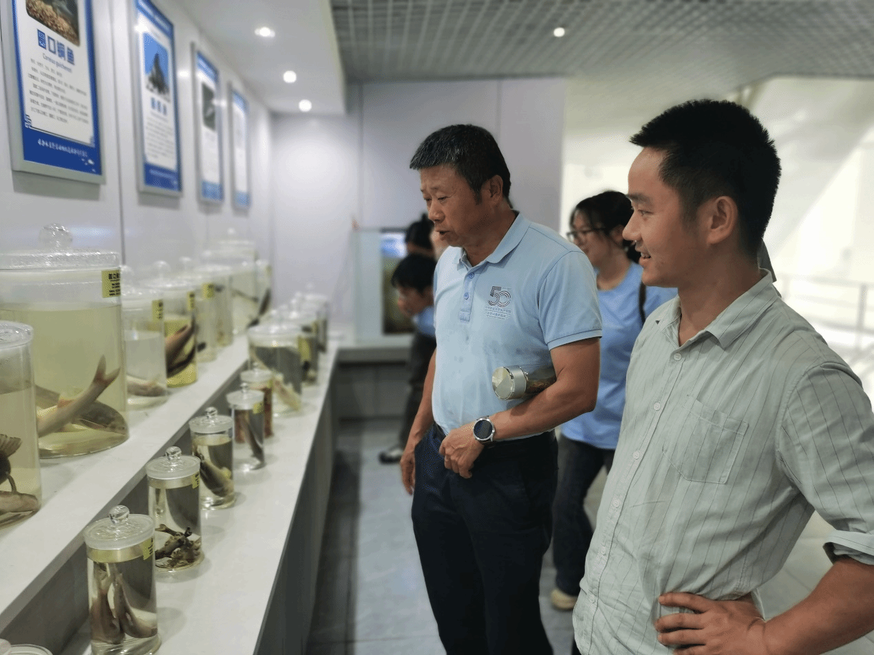 在渔政专业技术人员和学校沈建忠教授的指导下,实践团成员亲手将一批长江珍稀鱼苗(包括长江鲟等物种)放归母亲河,身体力行参与生态保护。随后,成员们参观了渔政所标本间。形态各异的鱼类标本和科学监测数据直观地展示了鱼类种群结构的优化趋势,一些多年罕见或数量稀少的物种开始回归,成为印证禁渔成效的有力物证。