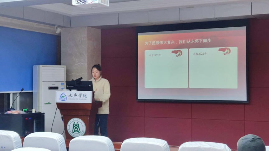 A105报告厅进行党的二十大精神“精读精讲”专题学习。学校宣讲团成员王雯瑄同学作题为“科学家精神:薪火相传中彰显时代特质”的报告,水产动物医学研究生第二党支部全体党员参与此次活动。