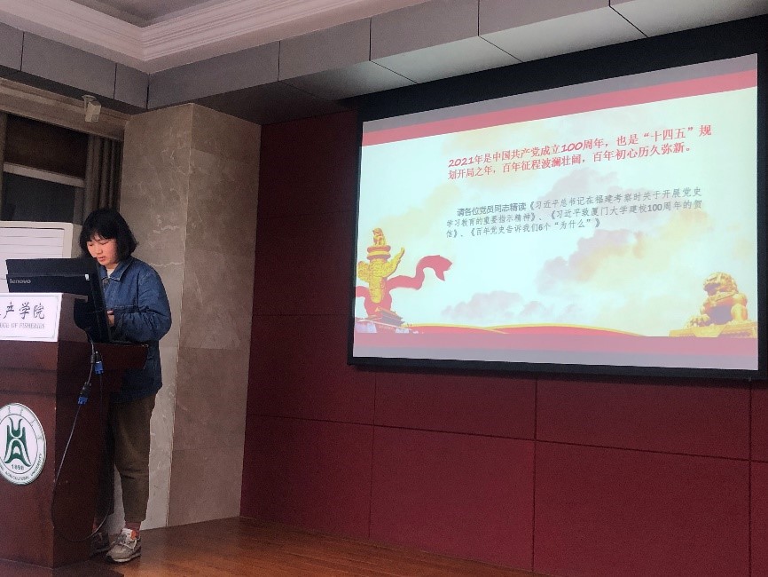 (通讯员:丁雨妍)2021年是中国共产党成立100周年,也是“十四五”规划开局之年,百年征程波澜壮阔,百年初心历久弥新。为此,422日晚九点十分,遗传育种与繁育研究生第二党部和营养与生理研究生党支部共同在水产楼109展开了四月份主题党日活动,育种二支部副书记罗奕主持会议。