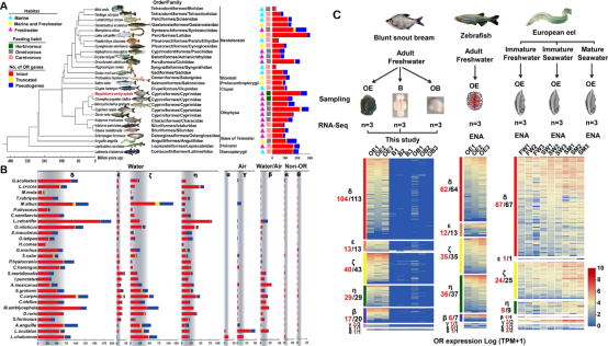 该研究基于比较基因组学探究了28种不同食性(草食性、肉食性、杂食性和滤食性)鱼类ORs的进化历程(图3),发现肉食性鱼类总ORs拷贝数显著低于草食性鱼类,淡水草食性鱼类特异性扩张ORs的β和ε亚型,这种扩张受到正选择压力驱使,通过对代表性鱼类的嗅觉器官转录组测序与分析,发现几乎所有ORs均表达,这一结果揭示了不同食性鱼类ORs的进化历程及其与食性的相关性,阐明了草食性鱼类和肉食性鱼类ORs的遗传基础,为进一步探究嗅觉在鱼类食性调控中的功能及分子机制奠定基础。