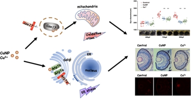 铜作一种必须的微量元素,在生物体内发挥一系列重要的功能,但铜在生物体内的稳态失衡会导致很多发育缺陷以及疾病的发生。研究铜稳态失衡下的鱼类胚胎发育学对研究鱼类环境胁迫的生物学响应以及适应性进化具有重要意义。为了研究铜对胚胎发育的影响,本团队以斑马鱼为研究对象,发现铜胁迫的胚胎存在小眼畸形以及受损的肠细胞,进一步研究表明视网膜和肠细胞中存在内质网应激和氧化应激,视网膜和肠细胞呈现凋亡;通过阻断内质网应激和氧化应激的产生均可以恢复缺陷表型。此外,本研究利用铜转运突变体atp7a-/-以及cox17-/-(atp7a-/-会阻断铜从肠道的正常吸收而cox17-/-会破坏线粒体正常的呼吸链而减缓氧化应激的产生),从遗传上揭示了基因atp7a以及cox17功能完整性在铜诱导的视网膜和肠道发育缺陷中的调控作用,并从遗传上进一步证实了铜通过氧化和内质网应激而导致鱼类胚胎视网膜和肠道系统发育缺陷的产生。两篇文章深入研究了铜胁迫造成胚胎发育缺陷的分子机制,首次发现铜是通过诱导应激和细胞凋亡影响胚胎视网膜和肠道系统发育。