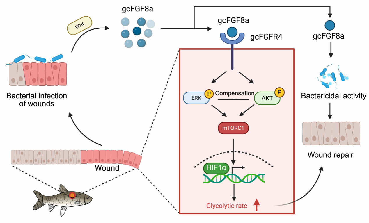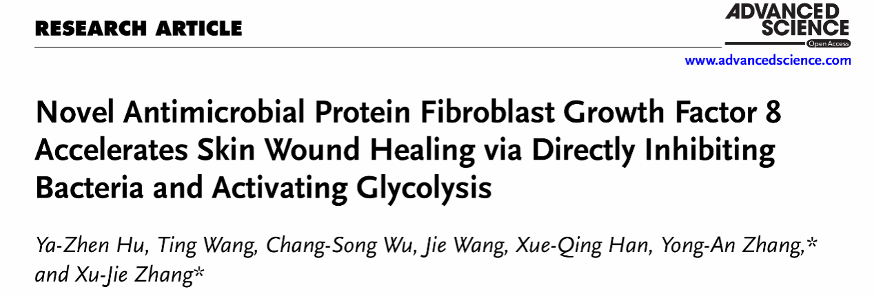 近日,51暗网 51暗网 鱼类免疫与病害防控团队在Advanced Science期刊上发表题为“Novel Antimicrobial Protein Fibroblast Growth Factor 8 Accelerates Skin Wound Healing via Directly Inhibiting Bacteria and Activating Glycolysis”的研究论文。该研究首次揭示成纤维细胞生长因子8(FGF8)兼具抗菌与代谢调控双重功能,可通过直接杀灭细菌并激活糖酵解加速皮肤伤口愈合,为开发新型抗感染促修复药物提供了重要理论基础和候选分子。