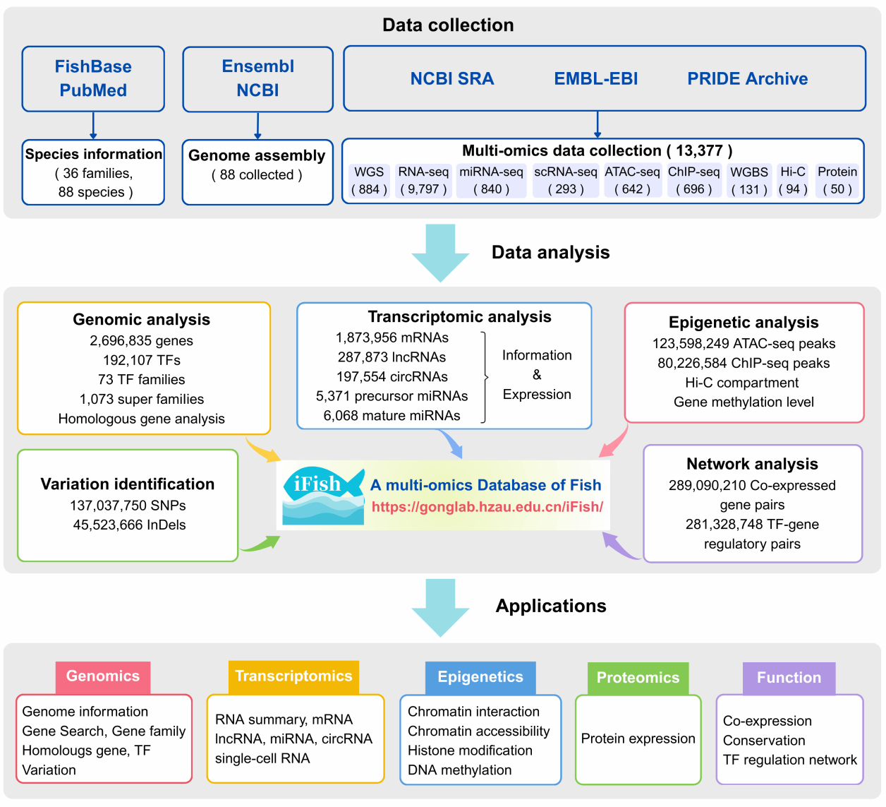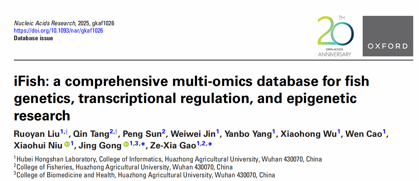 高泽霞教授团队联合信息学院龚静教授团队在Nucleic Acids Research期刊上发表题为“iFish: a comprehensive multi-omics database for fish genetics, transcriptional regulation, and epigenetic research”的研究论文。该团队开发的“iFish”综合性鱼类多组学数据库(//gonglab.51darkweb.net/iFish/),不仅整合了基因组图谱、基因表达谱、表观遗传修饰及蛋白质组数据,还实现了遗传变异、转录因子(TFs)及非编码RNA(ncRNAs)的系统鉴定。它是迄今为止系统整合、分析和存储鱼类多组学数据的最全面平台,将成为鱼类遗传学、转录调控和表观遗传学研究的重要资源。